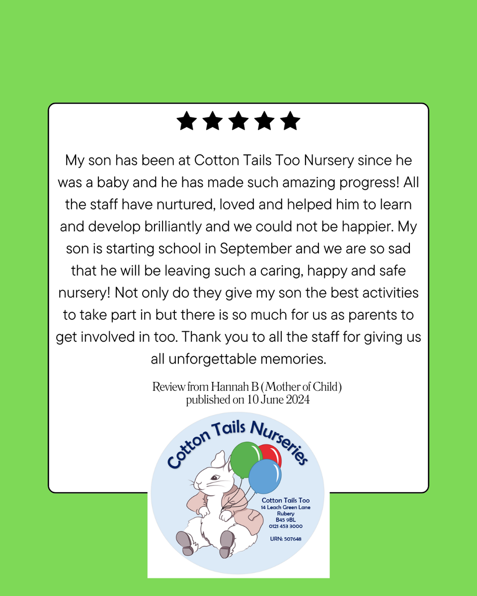 Cotton Tails Too Day Nursery, based in Rubery, Birmingham, has been caring for children aged 0–5 since 2001. We’re open Monday - Friday, 7:30am - 6:00pm, all year round (except bank holidays).